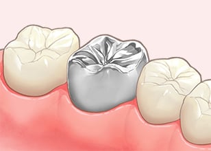 保険が適用となる素材です。お口の中では劣化してしまい、金属アレルギーの原因となる可能性があります。経済的ですが、虫歯再発のリスクが高いというデメリットがあります。